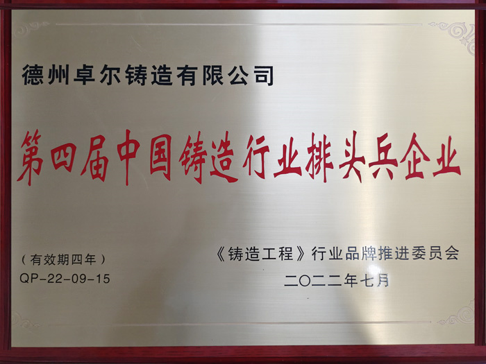 2022年7月25日,第九屆全國鑄造行業(yè)發(fā)展論壇暨中國鑄造協(xié)會第九界會議代表大會在天津勝利召開,德州卓爾科技有限公司榮獲“第四屆中國鑄造行業(yè)排頭兵企業(yè)”及“第四屆鑄造行業(yè)機(jī)床鑄件分行業(yè)排頭兵企業(yè)”榮譽(yù)稱號